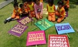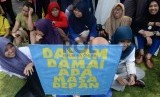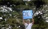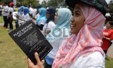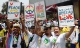 REPUBLIKA.CO.ID, JAKARTA -- Warga menunjukkan spanduk perdamaian dalam peringatan Hari Perdamaian Internasional di halaman Balai Kota DKI Jakarta, Ahad (20/9).