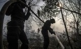 Dua orang anggota kepolisian memadamkan api di lahan gambut, Desa Rimbo Panjang, Kabupaten Kampar, Riau, Ahad (20/9). (Antara/Regina Safri)
