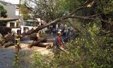 REPUBLIKA.CO.ID, BANDUNG -- Sejumlah petugas memotong pohon yang tumbang di Jalan Riau, Kota Bandung, Senin (21/9).