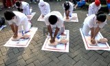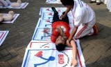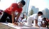 REPUBLIKA.CO.ID,JAKARTA -- Relawan memeragakan bantuan hidup dasar (CPR) saat Peringatan Hari Jantung Sedunia 2015 di Senayan, Jakarta, Ahad (27/9).