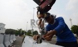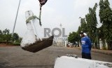 Petugas dari Dinas Perhubungan DKI Jakarta meletakan beton pembatas di silang Monas, Jakarta Pusat, Senin (28/9). (Republika/Raisan Al Farisi) (FOTO : Republika/Raisan Al Farisi)