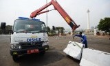 REPUBLIKA.CO.ID, JAKARTA -- Petugas dari Dinas Perhubungan DKI Jakarta meletakan beton pembatas di silang Monas, Jakarta Pusat, Senin (28/9).