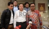 Anggota KY Taufiqurrohman Syahuri (kanan) usai menjalani pemeriksaan sebagai tersangka dalam dugaan pencemaran nama baik hakim Sarpin Rizaldi di Bareskrim Mabes Polri, Jakarta Selatan, Senin (28/9). (Republika/Raisan Al Farisi)