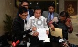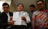 Anggota KY Taufiqurrohman Syahuri (tengah) menunjukan surat pernyataan Dewan Pers kepada media usai mejalani pemeriksaan dugaan pencemaran nama baik hakim Sarpin Rizaldi di Bareskrim Mabes Polri, Jakarta Selatan, Senin (28/9). (Republika/Raisan Al Farisi)
