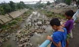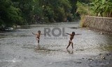 Dua orang anak bermain di aliran sungai ciliwung yang berada di Bendungan Katulampa, Bogor, Jawa Barat, Rabu (30/9). (Republika/Raisan Al Farisi) (FOTO : Republika/Raisan Al Farisi)
