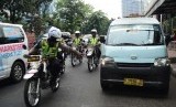 REPUBLIKA.CO.ID, JAKARTA -- Petugas Kepolisian yang tergabung dalam Subdit Gakkum Ditlantas Polda Metro Jaya melakukan patroli dalam rangkaian penertiban gabungan di sepanjang ruas Jalan Casablanca, Jakarta Selatan, Selasa (6/10).