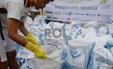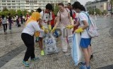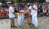 Relawan memasukkan sampah ke dalam karung saat aksi bersih-bersih di kawasan Hari Bebas Kendaraan Bermotor (HBKB), Jakarta, Ahad (18/10). (Republika/Yasin Habibi)