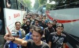 Para bobotoh mencari bis tumpangannya dipersiapkan di depan Gedung Sate, Jalan Diponegoro, Kota Bandung, Ahad (18/10). (Republika/Edi Yusuf)
