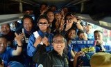 Para bobotoh di dalam bisa sebelum keberangkatan menuju Jakarta, di depan Gedung Sate Jalan Diponegoro, Kota Bandung, Ahad (18/10). (Republika/Edi Yusuf)