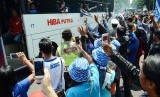Para bobotoh yang berangkat dikawal aparat keamanan saat keberangkatan bobotoh di depan Gedung Sate, Jalan Diponegoro, Kota Bandung, Ahad (18/10). (Republika/Edi Yusuf)