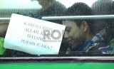 Tulisan para bobotoh saat keberangkatan bobotoh di depan Gedung Sate, Jalan Diponegoro, Kota Bandung, Ahad (18/10). (Republika/Edi Yusuf)