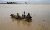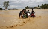Warga mendorong sepeda roda tiga di sepanjang jalan raya banjir di Sta Rosa, Nueva Ecija di utara Filipina, 19 Oktober 2015, ( REUTERS/Erik De Castro )