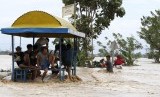 Warga bernaung di bawah gudang sebagai desa lainnya memegang tali untuk menyeberangi jalan banjir di tengah-tengah arus kuat di Sta Rosa, Nueva Ecija di Filipina utara 19 Oktober 2015, ( REUTERS/Erik De Castro )