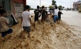 Warga menyeberang sepanjang jalan banjir di tengah-tengah arus kuat di Sta Rosa, Nueva Ecija di utara Filipina, 19 Oktober 2015, ( REUTERS/Erik )