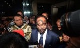 Ketua Umum Partai Nasdem Surya Paloh dimintai keterangan oleh wartawan sesaat sebelum menjalani pemeriksaan sebagai saksi di Gedung KPK, Jakarta, Jumat (23/10). ( Republika/Raisan Al Farisi )