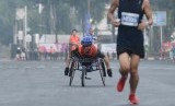 Seorang peserta difabel Jakarta Mandiri Marathon melintasi Kawasan Kota Tua, Jakarta Barat, Ahad (25/10). (Republika/Raisan Al Farisi)