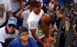 Pemain kesebelasan Persib, Firman Utina membawa trophy Piala Presiden 2015 saat pawai di Jalan Otto Iskandardinata, Kota Bandung, Ahad (25/10). (foto : Septianjar Muharam)