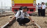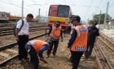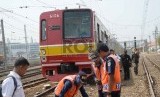 Petugas memeriksa rel kereta usai mengevakuasi Commuter Line tujuan Bekasi-Jakarta Kota KA 1347 anjlok di dekat Stasiun Manggarai, Jakarta, Selasa (27/10). (Republika/Yasin Habibi) (FOTO : Republika/ Yasin Habibi)