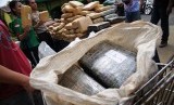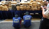 Dua dari tiga tersangka pengedar ganja ditunjukkan berikut barang bukti ratusan bal ganja kering di Mapolresta Depok, Jawa Barat, Kamis (19/11). (Antara/Indrianto Eko Suwarso)