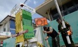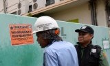 Petugas memasang plang penunggak PBB di depan PT DKB Dok Perkapalan Galangan I, Tanjung Priok, Jakarta, Senin (23/11). (Republika/Yasin Habibi) (FOTO : Republika/ Yasin Habibi)