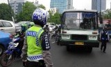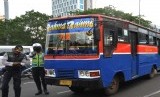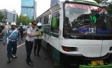 REPUBLIKA.CO.ID, JAKARTA -- Petugas memeriksa kelengkapan surat kendaraan sopir Kopaja saat razia gabungan angkutan umum di Jalan Sudirman, Jakarta, Senin (7/12).