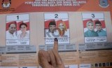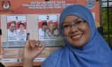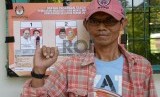 Warga menunjukkan tinta dijari usai menggunakan hak pilih pada pemungutan suara Pilkada Tangerang Selatan di TPS 32 yang bertempat di SMPN 11 Kota Tangerang Selatan, Rabu (9/12). (Republika/Yasin Habibi) (FOTO : Republika/ Yasin Habibi)