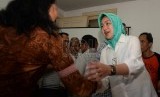 Calon Wali Kota dan Wakil Wali Kota Tangsel Airin Rachmi Diany mendapat ucapan selamat usai menggelar konferensi pers terkait hasil perhitungan cepat Pemilukada Tangsel di Tangerang Selatan, Rabu (9/12).(Republika/Yasin Habibi) (FOTO : Republika/ Yasin Habibi)