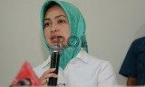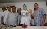 Calon Walikota dan Wakil Walikota Tangsel Airin Rachmi Diany menggelar konferensi pers tentang kemenangan dari hasil perhitungan cepat Pemilukada Tangsel di Tangerang Selatan, Rabu (9/12). (Republika/Yasin Habibi) (FOTO : Republika/ Yasin Habibi)