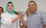 Calon Wali Kota dan Wakil Wali Kota Tangsel Airin Rachmi Diany dan Benyamin Davnie usai menggelar konferensi pers terkait hasil perhitungan cepat Pemilukada Tangsel di Tangerang Selatan, Rabu (9/12). (Republika/Yasin Habibi) (FOTO : Republika/ Yasin Habibi)
