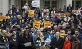 Ketua Dewan Kota New York Melissa Mark-Viverito berbicara di depan para pengunjuk rasa yang menentang pernyataan kandidat calon presiden AS, Donald Trump, yang melarang muslim untuk masuk ke AS di New York, Rabu (9/12). (AP/Mary Altaffer)
