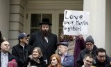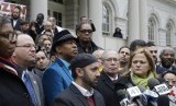 Ketua Dewan Kota New York Melissa Mark-Viverito (kanan) mendengarkan Imam Khalid Latif saat berbicara di depan para pengunjuk rasa yang menentang pernyataan kandidat calon presiden AS, Donald Trump, yang melarang muslim untuk masuk ke AS di New York, Rabu