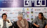 (dari kiri) Jaka Bimbo, Iin Parlina, dan Acil Bimbo menghadiri konferensi pers Konser Indonesia Menyanyi Bimbo di Jakarta, Jumat (11/12). (Republika/Wihdan)