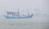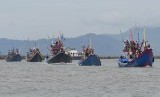 Sejumlah perahu nelayan berpawai memeriahkan Puncak Peringatan Hari Nusantara ke-15 di Pelabuhan Perikanan Samudera Lampulo, Banda Aceh, Aceh,Ahad (13/12). (Antara/Akbar Nugroho Gumay) (FOTO : Antara/Akbar Nugroho Gumay)