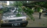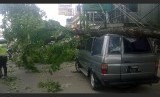 Sebuah mobil minibus ringsek tertimpa pohon yang tumbang di Jalan Akses UI, Depok, Jawa Barat, Senin (13/12). (foto : MgROL_54)