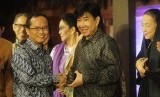 Direktur Operasi ANTAM, Agus Zamzam Jamaluddin (kiri) memberikan cinderamata kepada Budayawan Guruh Soekarnoputra ketika peluncuran logam mulia bermotif batik di Taman Mini Indonesia Indah (TMII) Jakarta, Rabu (16/12). (Antara/Wahyu Putro)