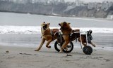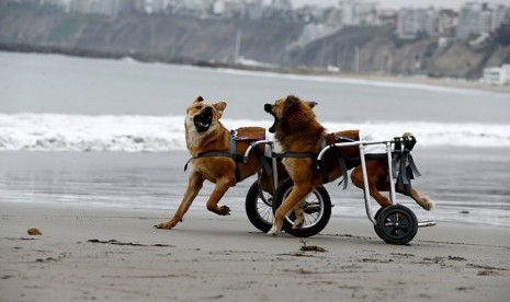 Pelusa and Huellas, dua ekor anjing lumpuh memakai kursi roda bermain di pantai Chorrillos, Lima, Peru. (Reuters/Mariana Bazo)