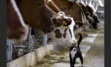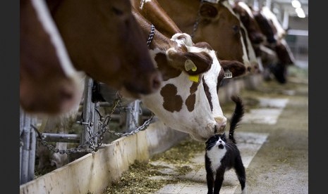 Seekor sapi perah bermain dengan kucing di sebuah peternakan di Granby, Quebec, Kanada. (Reuters/Christinne Muschi)