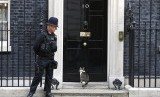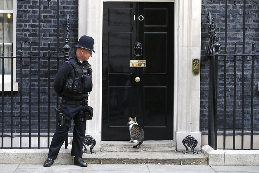 Seekor kucing berdiri di depan pintu kediaman Perdana Menteri Inggris, Downing Street 10, London. (Reuters/Peter Nicholls)