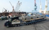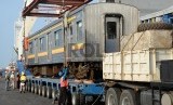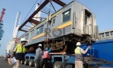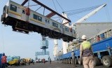 REPUBLIKA.CO.ID, JAKARTA -- Pekerja dibantu alat berat memindahkan gerbong KRL dari kapal di Pelabuhan Tanjung Priok, Jakarta, Rabu (6/1).