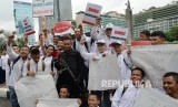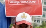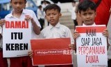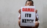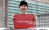 Aksi simpatik #kamitidaktakut digelar sejumlah siswa siswa SD sampai SMA di depan pos polisi bundaran HI, Jakarta Pusat, Jumat (15/1). (Republika/Yasin Habibi)