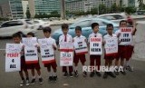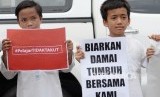 Aksi simpatik #kamitidaktakut digelar sejumlah siswa siswa SD sampai SMA di depan pos polisi bunderan HI, Jakarta Pusat, Jumat (15/1). ( Republika/ Yasin Habibi )