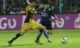 Pesepakbola Arema Cronus, Dendi Santosa (kiri) berusaha melewati pesepakbola Mitra Kukar, Dapid Maulana (kanan) dalam pertandingan semifinal Piala Jenderal Sudirman leg kedua di Stadion Kanjuruhan, Malang, Ahad (17/1). (Antara/Ari Bowo Sucipto)