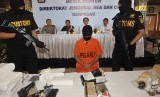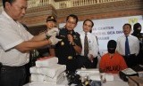 Petugas Bea Cukai Denpasar menunjukkan warga negara Belanda berinisial DH (tengah) yang menerima paket narkoba saat gelar kasus pengiriman narkoba lewat Kantor Pos di Pelabuhan Benoa, Denpasar, Selasa (19/1). (Antara/Nyoman Budhiana) (FOTO : Antara/Nyoman Budhiana)