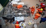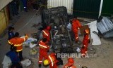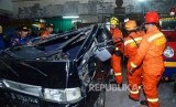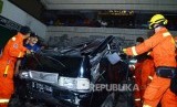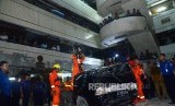 Petugas mengevakuasi bangkai mobil boks yang jatuh dari lantai 4 ke lantai dasar Pasar Cipulir, Kebyoran Lama, Jakarta Selatan, Selasa (19/1). (foto: MgROL_54)