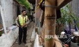 Polisi berjaga di lokasi penggerebekan rumah bandar narkoba di bantaran sungai Ciliwung Jalan Slamet Riyadi 4, Kebon Manggis, Matraman, Jakarta Pusat, Rabu (20/1). (Republika/Yasin Habibi) (FOTO : Republika/ Yasin Habibi)