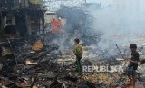 Petugas pemadam kebakaran dibantu oleh warga mencoba memadamkan api yang telah membakar rumahnya di Kampung Bandan, Jakarta Utara, Selasa (26/1). (Republika/Raisan Al Farisi)
