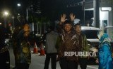 Mantan Ketua Majelis Pertimbangan PPP Bachtiar Chamsyah (tengah) melambaikan tangan bersama anggota majelis dan senior lainnya setelah memberikan keterangan kepada media usai bertemu dengan Wakil Presiden Jusuf Kalla di Jakarta, Selasa (26/1). (Republika/