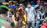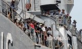 Petugas membantu warga eks anggota Gerakan Fajar Nusantara (Gafatar) yang baru turun dari KRI Banten saat tiba di Pelabuhan Kolinlamil Tanjung Priok, Jakarta Utara, Rabu (27/1). (FOTO : Republika/ Yasin Habibi)