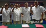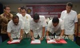 Calon Gubernur DKI dari Partai Gerindra Biem T. Benjamin, Sandiago Uno, dan M. Sanusi (dari kiri ke kanan) menandatangani surat pencalonan Gubernur saat acara penjaringan Cagub DKI di Jakarta, Rabu (27/1). (Republika/Raisan Al Farisi)