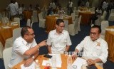 Calon Gubernur DKI dari Partai Gerindra M. Taufik (kanan), Sandiago Uno (tengah) dan Biem T. Benjamin (kiri) berbincang saat acara penjaringan Cagub DKI di Jakarta, Rabu (27/1). (Republika/Raisan Al Farisi) (FOTO : Republika/Raisan Al Farisi)
